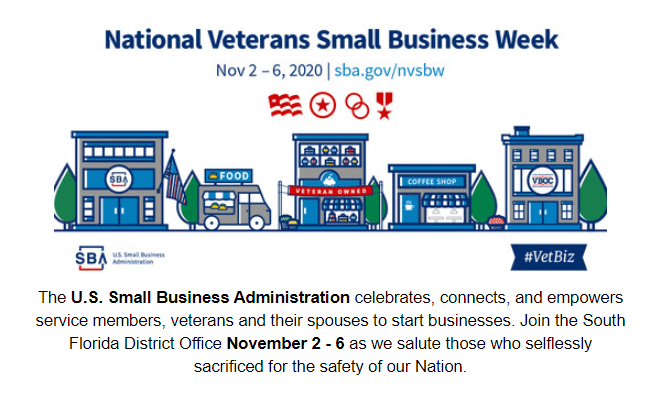 The U.S. Small Business Administration is hosting the annual National Veterans Small Business Week. Held from Monday, November 2 through Friday, November 6, 2020 to provide a plethora of resources that address issues facing small businesses owned by Veterans, including certification guidance and access to capital. All sessions are held virtually and registration is free for participants.